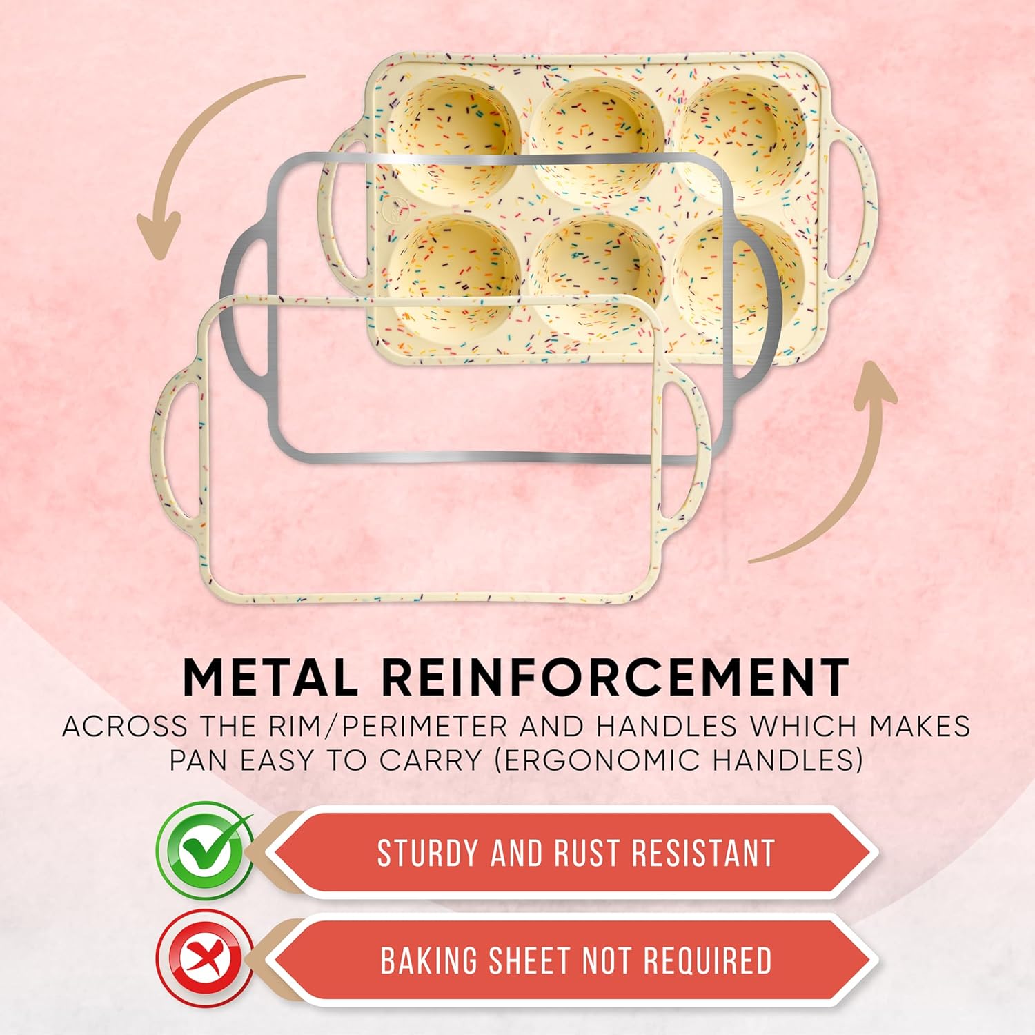 - Sturdy & Spill-Proof – Reinforced Rim on Every Cup: The Bake Boss silicone jumbo muffin pan features a built-in metal frame that keeps your muffin pan silicone stable—no bending, no spills, just smooth oven transfer