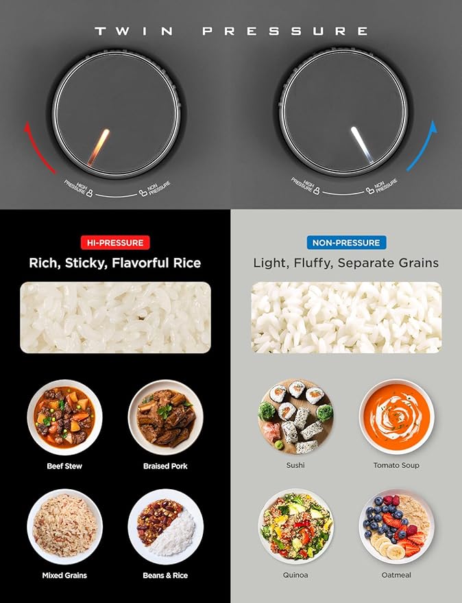 - Dual Cooking Pressure Selections: Choose between high-pressure and non-pressure cooking for sticky or fluffy rice