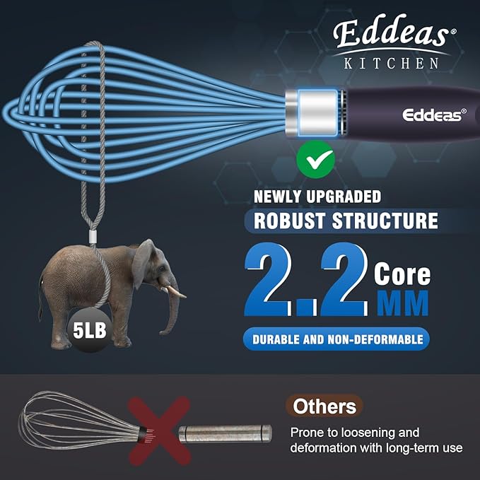 - 1.PROFESSIONAL SILICONE WHISK FOR COOKING NON SCRATCH- EDDEAS Silicone Whisks head is made of 1.4 mm durable stainless steel wires coated in 0.75mm professional non scratch silicone.Food grade Silicone material is softer and more flexible,with a more smooth surface that won't scratch or damage the surface of your pans, pots or bakeware., which provides strong support when stirring.