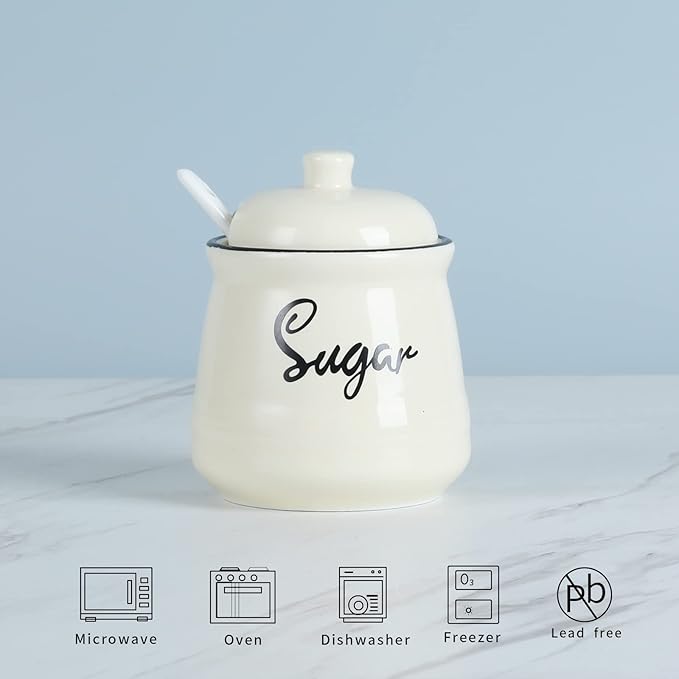 - PERFECT COMBINATION: This sugar bowl is equipped with a perfect lid and a small spoon. The lid can keep your ingredients away from dust. There is a perfect notch on the lid for placing the spoon, so you don’t have to worry about placing the spoon randomly