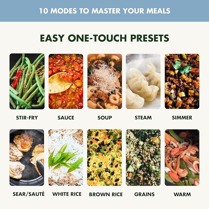 - 10-IN-1 DESIGN: Stir-Fry, Sauce, Soup, Steam, Simmer, Warm, Sear/Sauté, White Rice, Brown Rice, Grains.