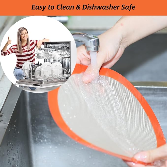 - 【SMOOTH SURFACE, TOUGH AND TENSILE INTERIOR】These non-stick silicone round baking mats 10 inch are easy to use whether you are highly skilled in baking or not. With smooth, shiny surface, you will find the cleanup an easy peasy. Just simply rinse off in warm soapy water and let it dry. If you want to maximize time saving, dishwasher is also a good alternative. On the other hand, with tough and tensile interior, they’re very durable which helps you save money imperceptibly day by day.