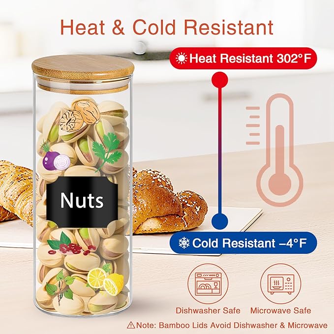 - 【Ultra-Durable】Built with borosilicate glass, the glass pantry storage containers set with airtight bamboo lids withstand -4°F to 302°F without cracking. Designed for daily use, these durable food jars & canisters retain integrity through all temperature changes.
