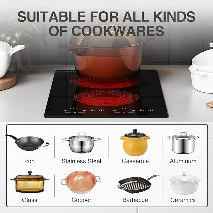 - Compatible with All Cookware Countertop Stove β Unlike induction cooktops, this radiant electric cooktop works with any flat-bottom cookware including stainless steel pans, aluminum pots, ceramic, glass, copper, and cast iron skillets. Simple installation and an included manual make setup quick and easy for everyday cooking needs