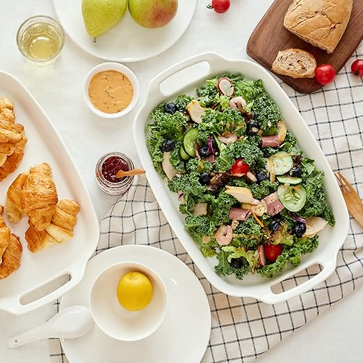 - Convenient Loop Handles Design: DOWAN Ceramic white serving platters are deeper with built-in handles on both sides, making it easy to move foods around at any time; This platter set is designed with an ergonomic rectangle shape, and its wide handles have a comfortable grip for transporting food over long distances