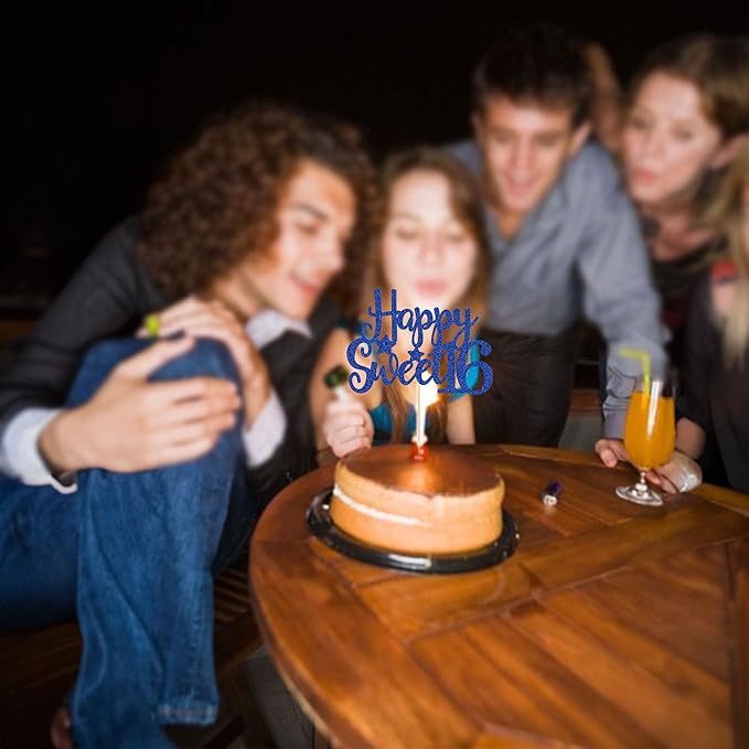 Gyufise 1Pc Happy Sweet 16 Cake Topper Blue Glitter Sweet 16 Birthday Cake Decoration Happy 16th Birthday Decorations for Girls Boys Party Supplies