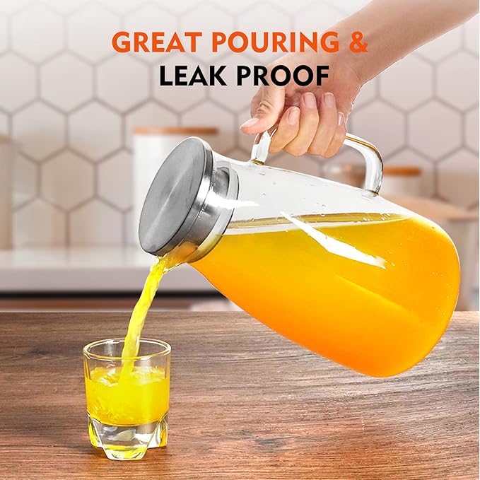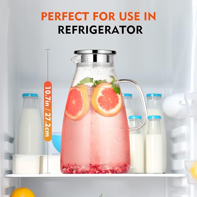 - DURABLE & SAFE - Our water pitcher is made of lighter and stronger borosilicate glass with lead-free for a healthy life. This glass is tested to be the most reliable type of glass and can withstand temperatures from 0 to 300 โ. It is safe that you put pitcher on the stovetop or refrigerator, so you can enjoy cold or hot drinks anytime.