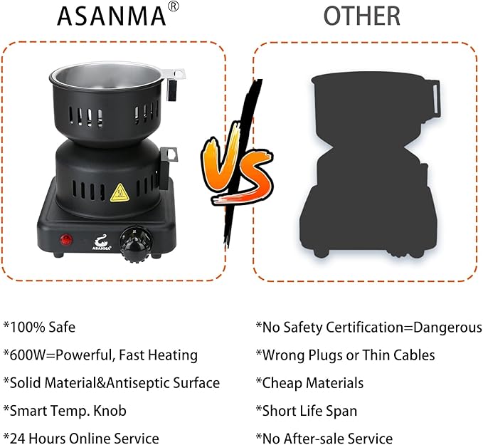 - Heat Fast - Our coal burner feature in 120V ~ 600W,the electric coil burner heat up fast, there are 5 gear adjustable,when you use max gear,only need 7-10 minutes, all sides of the coals will be blazed red.(when temperature high,the red button jumps at intervals to pretect circuit).