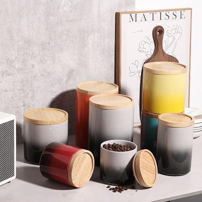Sweejar Ceramic Food Storage Jar, Stackable Kitchen Canisters, Containers with Airtight Seal Wooden Lid for Serving Coffee Grounds, Coffee Bean, Flour, Tea, Spice and More - 39 Fl Oz (Gradient Gray)