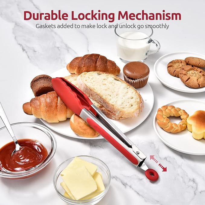 - [Easy & Ergonomic Locking Mechanism] The upgraded food serving tong has a smooth locking mechanism. With the added gaskets, you can easily lock and unlock the tongs. With more and larger 18/10 stainless steel springs, it achieves a great balance between too tight to open and too loosen to grasp food. Simply hold the open tongs closed, pull the tab out to lock them closed and push the tab in to re-open for grabbing food. The pin holds two parts of the tong is tightly, no breaking issues.