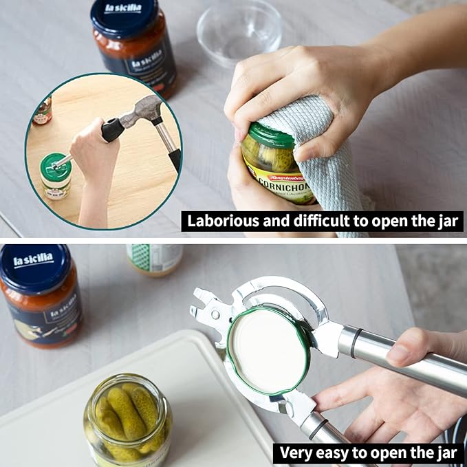 - Sturdy and Safe Material: The jar opener is made of high-quality iron and stainless steel material, which is anti-deformation, anti-rust, high hardness, and safe to touch food