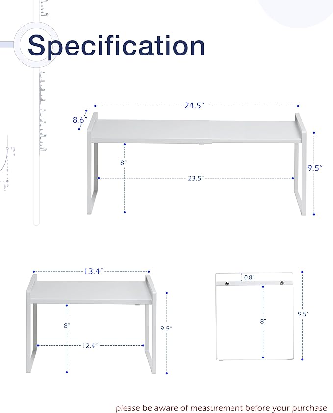 - EXPANDABLE: You may expand the width of this freestanding cabinet shelf to your desires. It can easily vary from 13.4 inches to 24.5 inches in width depending on how you want to organize your space. Specification: 8.6’’D * 13.4-24.5’’W * 9.5’’H