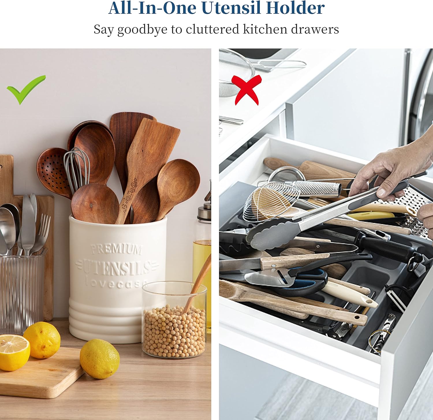 - 【LARGE & DEEP UTENSIL HOLDER】 LOVECASA ceramic utensil holder with a large space(7.2" height × 6.1” width) to organize common 10-15 Pieces of kitchen utensils, which is easier to get in and out of utensils when cooking. This utensil crock let you say goodbye to cluttered kitchen drawers.