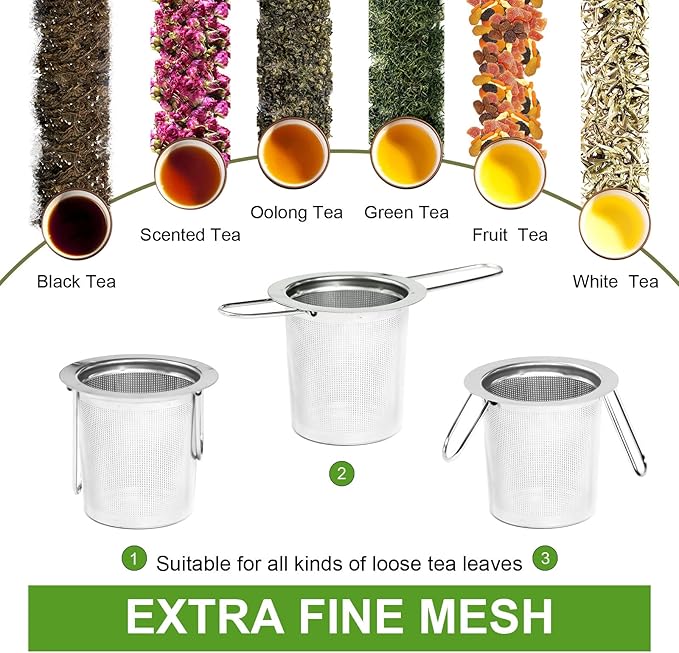 - EXTRA FINE MESH DESIGN: Tea strainers for loose tea consist of ultra-fine mesh; 6000 evenly distributed mesh holes with a diameter of about 0.007 inches that can easily block small tea leaves so that there are no tiny particles outside the tea strainer; Let loose leaf tea in hot water, rapid and sufficient expansion without affecting the aroma of the tea; It can be used to filter black tea, rooibos tea, green tea, scented tea, etc.