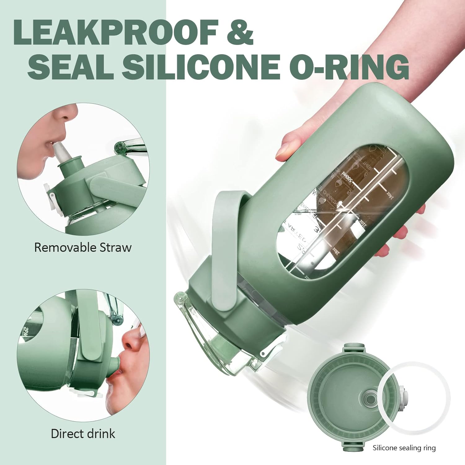 - ❤High-Quality Borosilicate Glass Bottle- This large motivational water bottle is made of odorless, quality, borosilicate glass. Straw and lid are made of food-grade PP, BPA-free and eco-friendly.