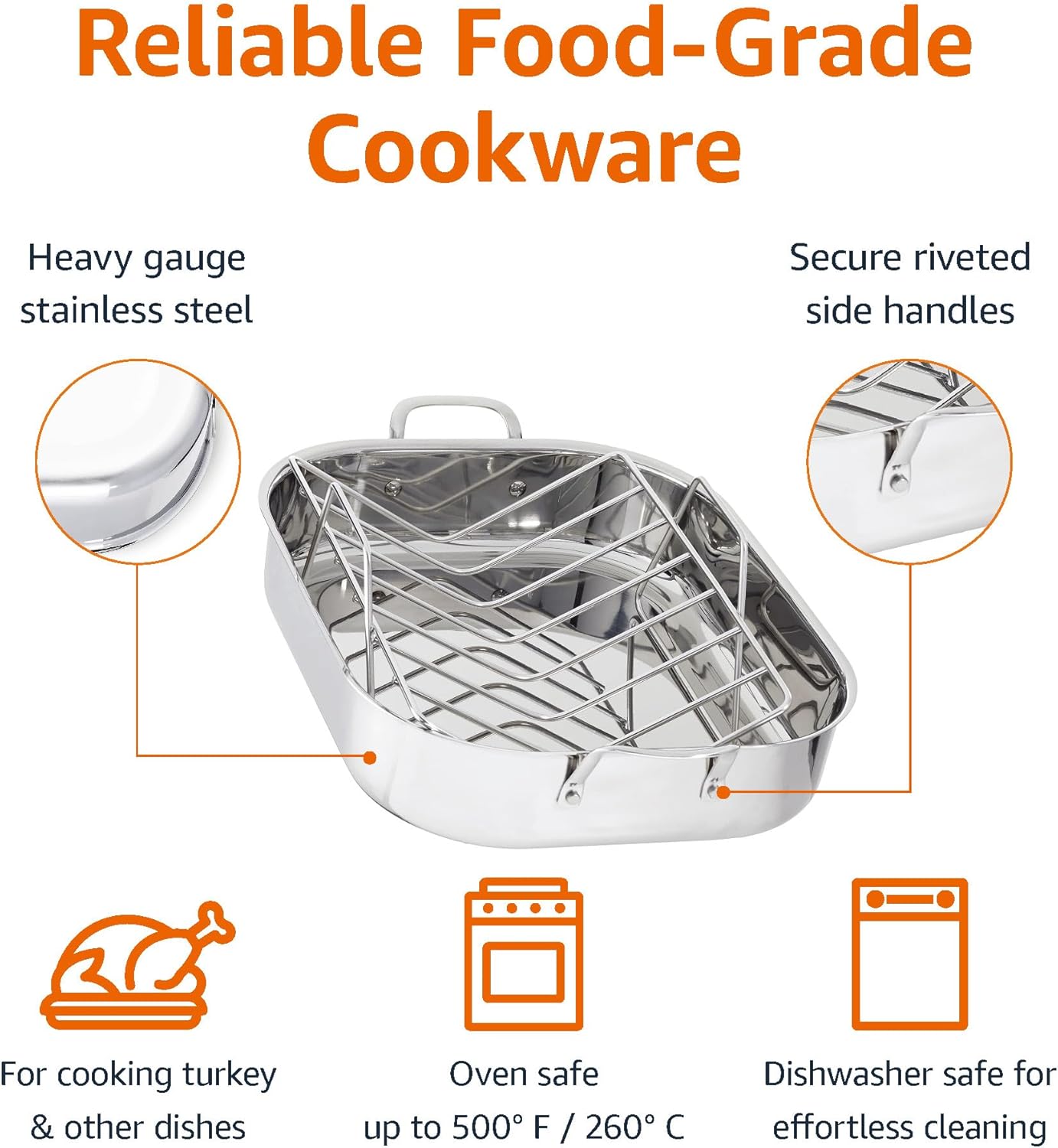 - Includes a 16-inch rectangular roaster and a V-shaped rack made from heavy-gauge, food-grade stainless steel