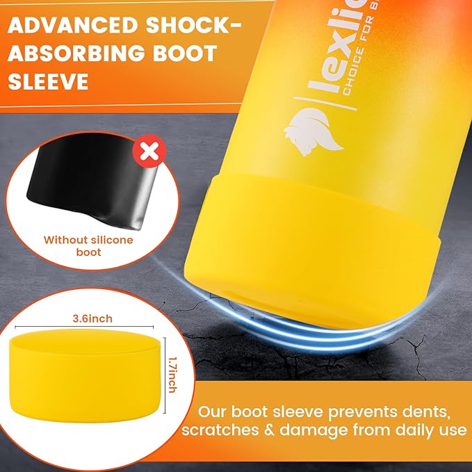 - ✅ SILICON BOOT/SLEEVE- Lexlion 32 oz stainless steel water bottle comes with an advanced shock-absorbing silicone material that helps to protect against dents, dings, scratches, and all the imperfections of your 32 oz insulated water bottle. You are protected against an inevitable drop in your water infuser bottle. This will extend the life of your flask. The infuser water bottle is BPA-free and made of soft and highest-quality material.