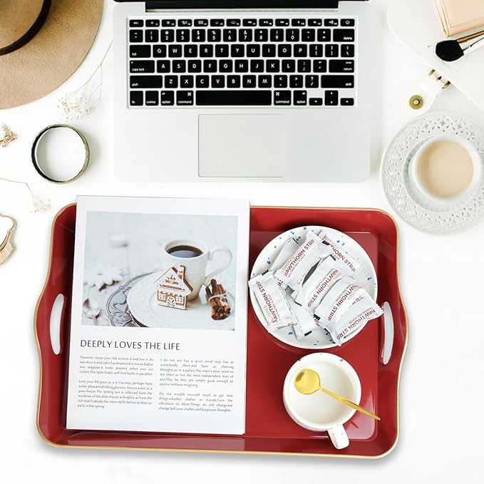 Spsyrine Large Red Decorative Tray, Elegant Plastic Serving Tray with Handles, Coffee Table Tray for Ottoman, Living Room, Home Decor 17.3"*11.8"*2"