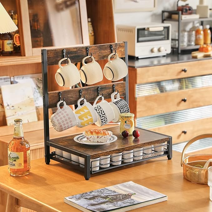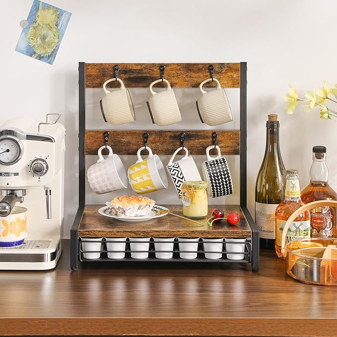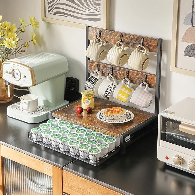 IBUYKE Coffee Pod Drawer, Rustic Coffee Mug Holder for Countertop, 8 Hooks and 35 Capsules Capacity, Coffee Station Organizer with Mug Hooks, Wood Mug Tree Holder for Kitchen Coffee Bar,TCJ003H