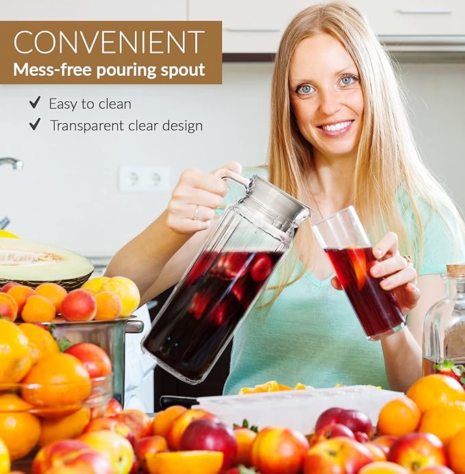 - This juice pitcher is made using finest quality, highly durable materials, a combination of non-BPA food-grade glass and plastic, being easy to clean, dishwasher safe and designed to last for many years.