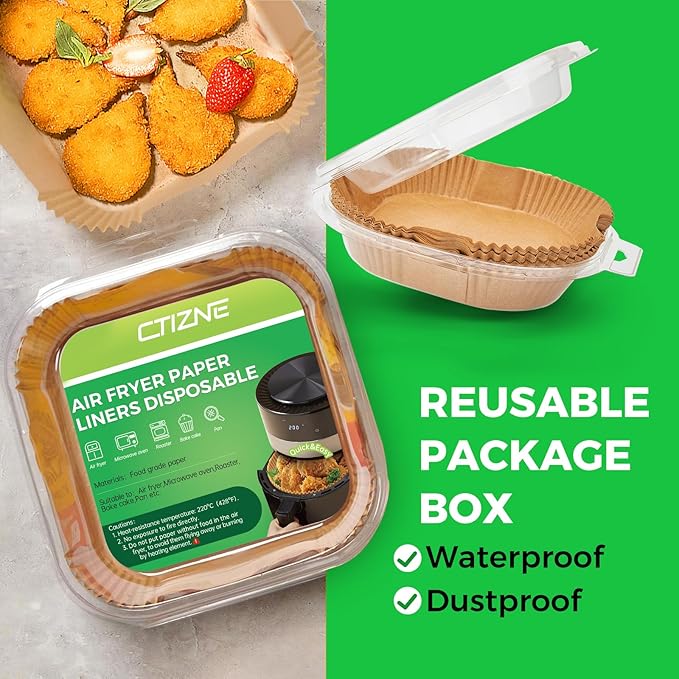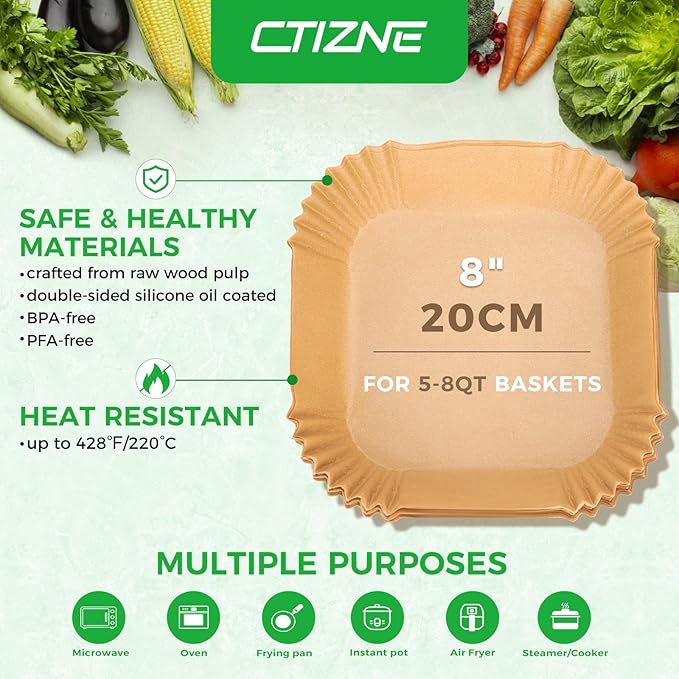 - Liners Size: Ctizne air fryer paper liners are in 8 inches at bottom diameter, suitable for both round and square baskets between 5 and 8 qt. Heat resistant temperatures up to 428 fahrenheit