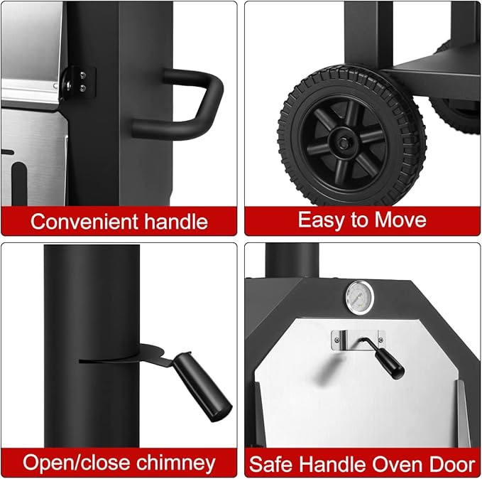 - 【Practical Design】There is a detachable storage space for carbon ash, which is convenient for you to remove carbon ash. Easy to move with 2 large wheels and a side handle. An open shelf under the oven where you can store wood.
