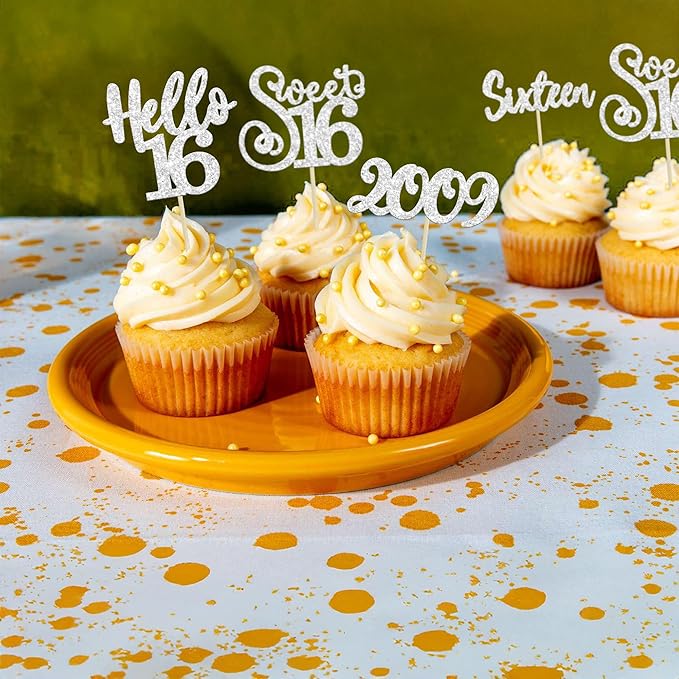 Gyufise 24Pcs 16th Birthday Cupcake Toppers Silver Glitter Hello 16 Sweet 16 Cupcake Picks 2009 16th Birthday Cake Decorations for Celebrating 16th Birthday Anniversary Party Supplies