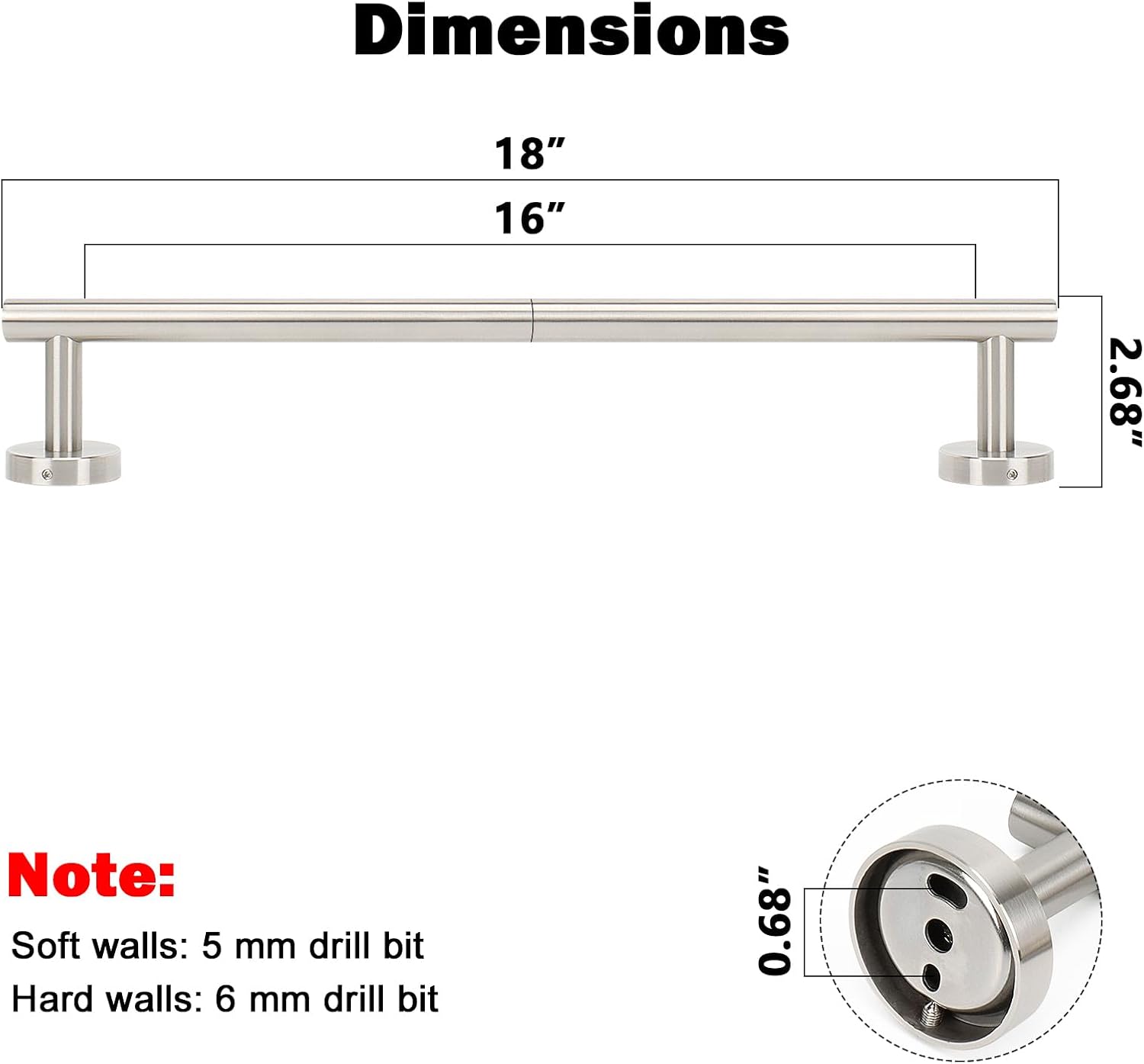 - DIMENSIONS & USE: Overall length is 18" (457mm). The length of hanging space is16" (405mm). 22-Lbs (10kgs) max weight capacity. You can mount this towel bar to either side of your cabinet or closet door for storing at-use hand and dish towels. It can also be used with S hooks, hanging bath balls, hair dryers, tea cups, spoons, clips, etc.