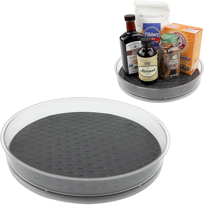 - Durable and Smart Design: Crafted with high quality materials to withstand heavy daily usage. The sides are enclosed to keep items from falling or spilling out of this medium turntable. An anti-slip tray ensures your condiments and seasonings won't shift or tip when the tray organizer is in use. Plus, it’s easy to clean. Simply hand wash with soap and warm water.