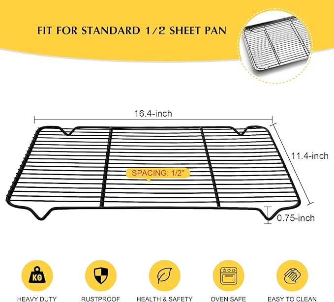 - VERSATILE - Measures 16.4 inch x 11.4 inch, Fit for 18”x13” half sheet pan, Perfect for cooling cakes, pies and tarts, baking cookies, pizza and bacon, grilling and smoking meats like steak and chicken wings, roasting vegetables and fries, dripping grease and sauce off the food, decorating donuts or cake, Idea gift for your family and friends