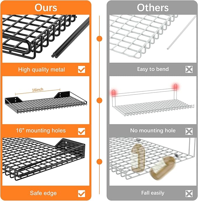 - Safe Edge: Wall mounted shelving has safe and no sharp edges, it is very important that nothing will slide off the shelf.