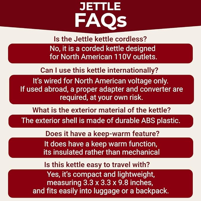 - Bring It Anywhere - Small in size yet mighty in capacity. Our 450ml Jettle is bigger than most of our competitors, which means you can enjoy more of your beverage without needing to refill! No need to bring bulky hot water pots when you go traveling. Measuring 3.3x3.3x9.8", this portable hot water kettle will easily fit inside your luggage, backpack, or duffel bag. NOTE: This is wired for North American voltage ONLY. To use internationally at your OWN RISK you would need and adapter and converter.