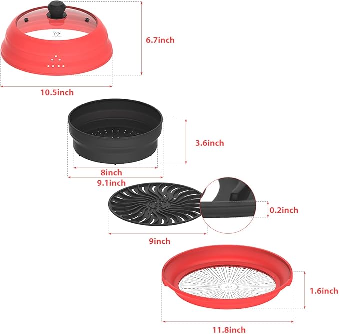 - 【Food Grade Material】: Food safe durable tempered glass and silicon, BPA and chemical free, High-temperature resistant glass, Foldable silicon microwave cover, Includes plate cover and tray to protect your microwave from splashes and spots. The tray has two handles to prevent burns and allow you to quickly remove heated food.