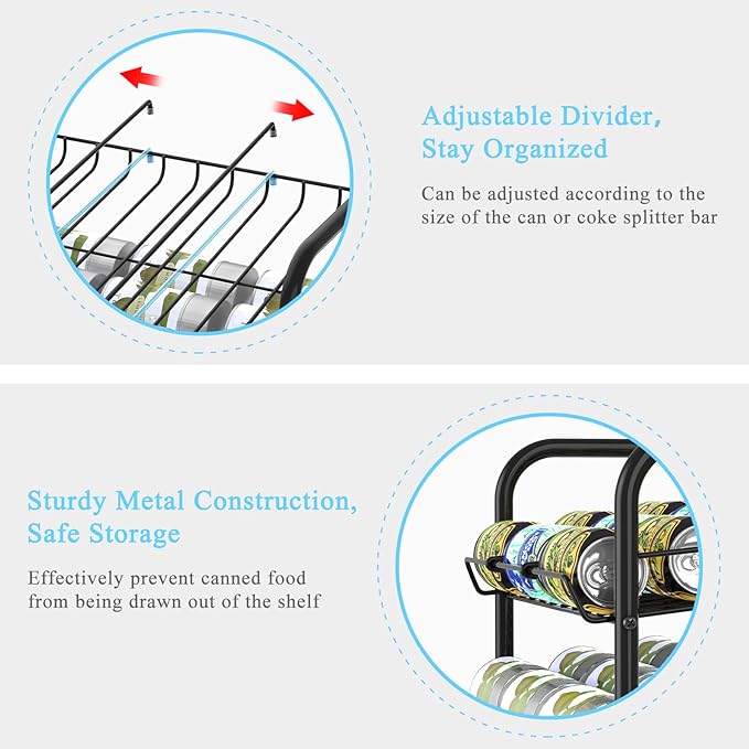 - 【Perfect Size】 - The can rack size is 16.89*12.44*35.35. Each tier comes with 2 adjustable dividers, which can help you sort and manage cans and beverages and keep the storeroom/cabinet/pantry in order.