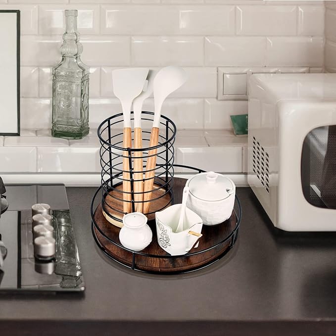 12 Inch Wood Lazy Susan, Rustic Brown Turntable Organizer with Steel Frame, 360 Degree Decorative Turntable for Countertop or Centerpieces