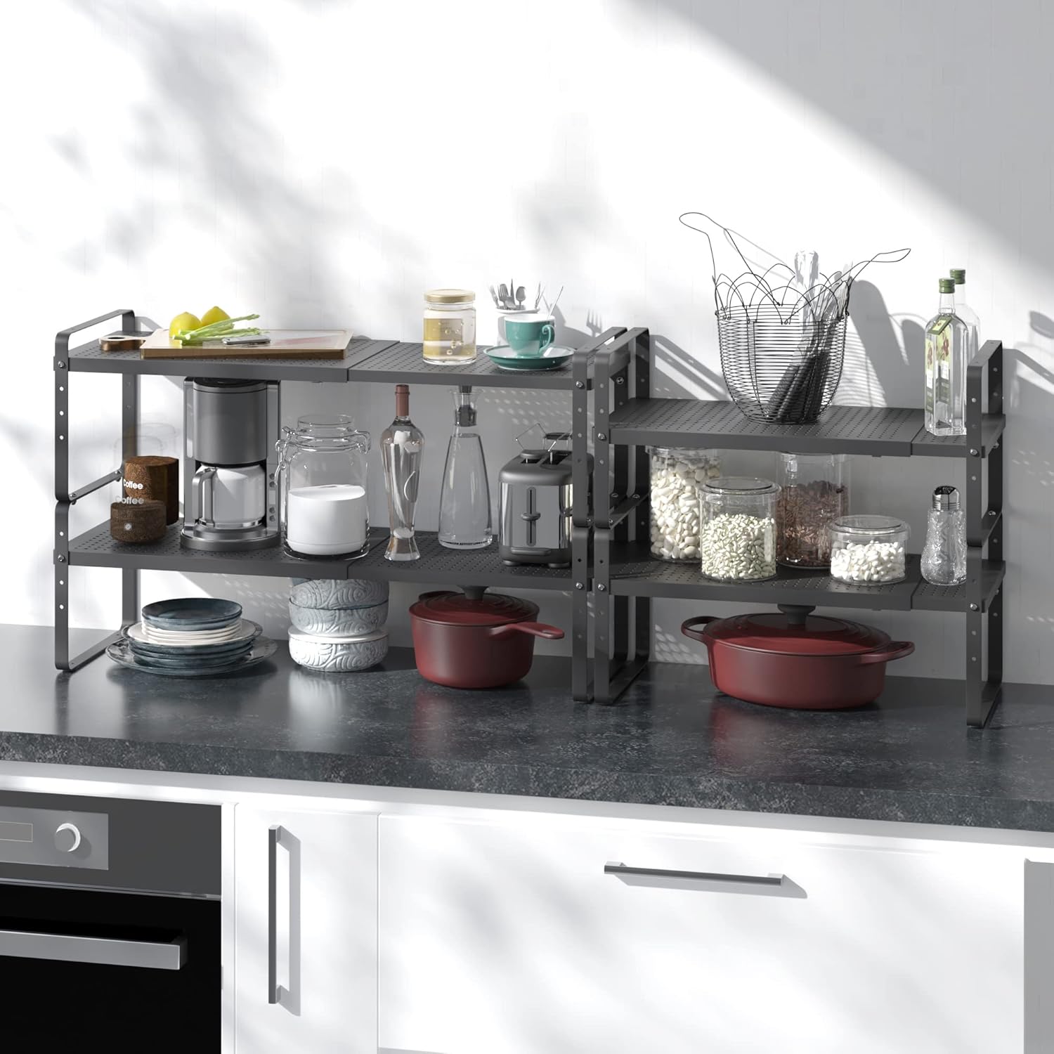 - Expandable &Stackable Cabinet Shelf Organizer: The width and height of the expandable kitchen cabinet shelves can be adjusted according to your needs, which is a very practical storage shelf. The dimensions before expansion are 16.5 "L x 8" W x 9.6 "H. Its length can be extended from 16.5" to 27". You can also stack the 2pack shelves together to form a two-layer storage space. Or it can be used as 2 single shelves separately