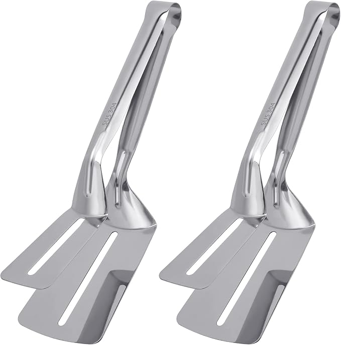 - 【Unique and Thoughtful Design】The slotted design on these steak clamps cleverly drains excess oil back into the pan, making your food healthier. The multifunctional spatula-tongs combination allows for seamless flipping and frying operations, making cooking a breeze.