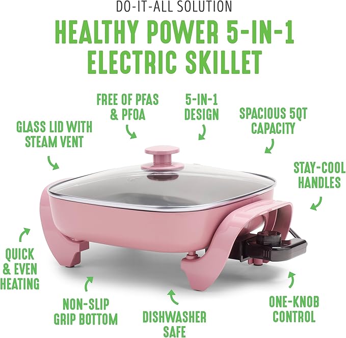 GreenLife12" 5QT Square Electric Skillet, Glass Vented Lid, Ceramic PFAS-Free Nonstick Coated Interior, Adjustable Temperature Control, Cool Touch Handles, Quick Even Heating, Scratch Resistant, Pink