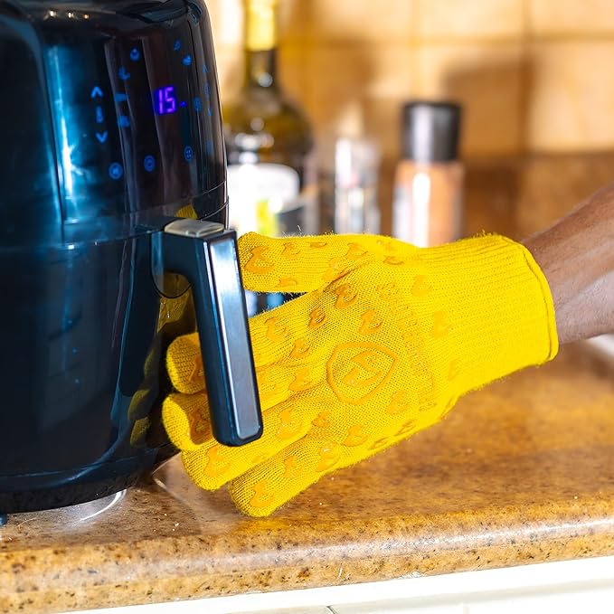 - Comfort - Thick but lightweight oven gloves, with flexible five fingers flex design and silicone super-grip. With this fire glove design you can easily grab a pizza stone, a cast iron and Dutch oven that are too hot to handle. When wearing these oven gloves, you are free to hold hot pots and pans, stuff from the oven, microwave, instant pot, smoker, fryer and more!