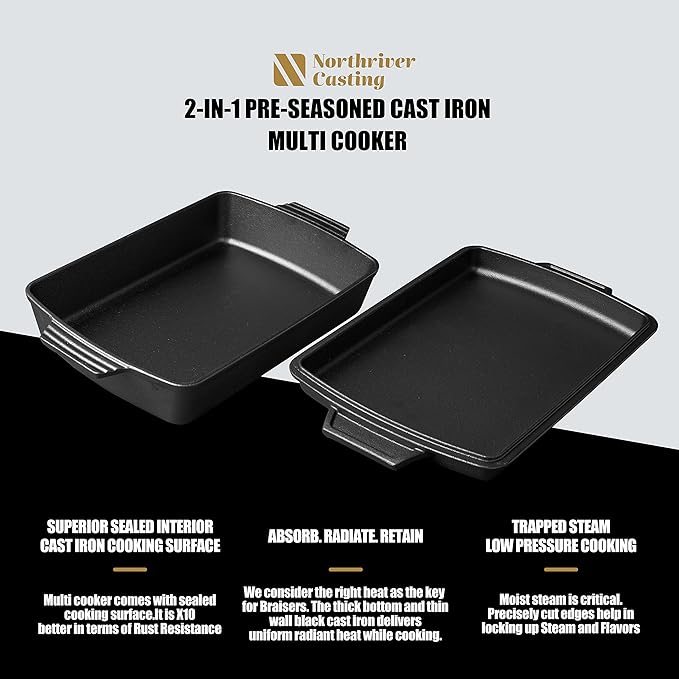 2-In-1 Pre Seasoned Cast Iron Dutch Oven With Skillet Lid,Casserole Dish,Rectangular Baking Pan,Griddle Pot Set, 6QT, 9"x13"