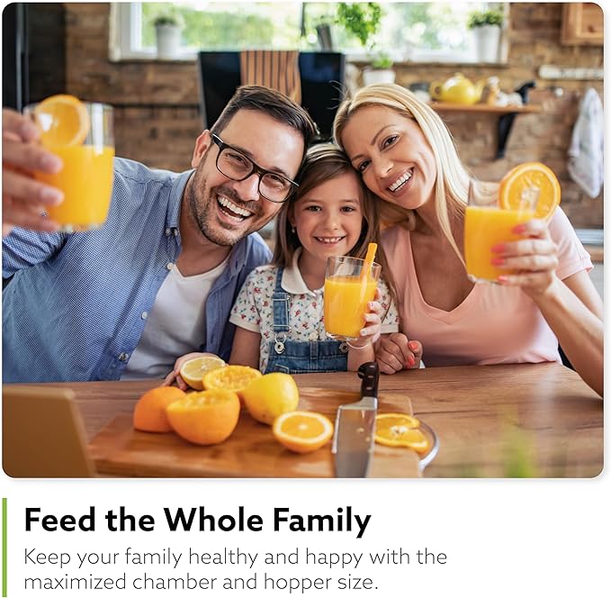 - PERFECT FOR FAMILIES: The quiet motor lets you start the morning without causing a stir. The maximized self-feeding hopper lets you fit more ingredients without chopping them up for minimal prep. 100% BPA free with no blades or sharp parts.