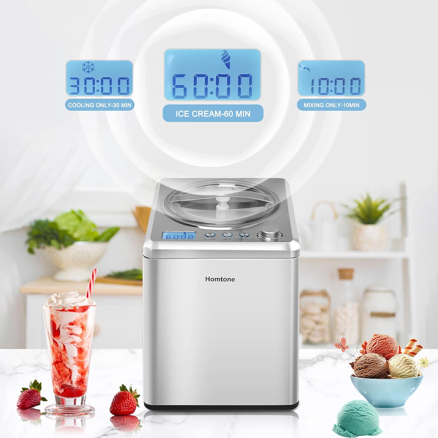 - ăOne-Button Operation, Enjoy Delicious EasilyăïŒThe Homtone ice cream maker comes with an intuitive LCD screen, simple buttons and auto-shut-off function. Just add the ingredients, lock the lid and press the button. No pre-freezing of ingredients is needed, and the process is fully automatic. The digital display monitors progress in real time, and an alarm reminds you when itâs done. Itâs easy for both newbies and professionals to use.