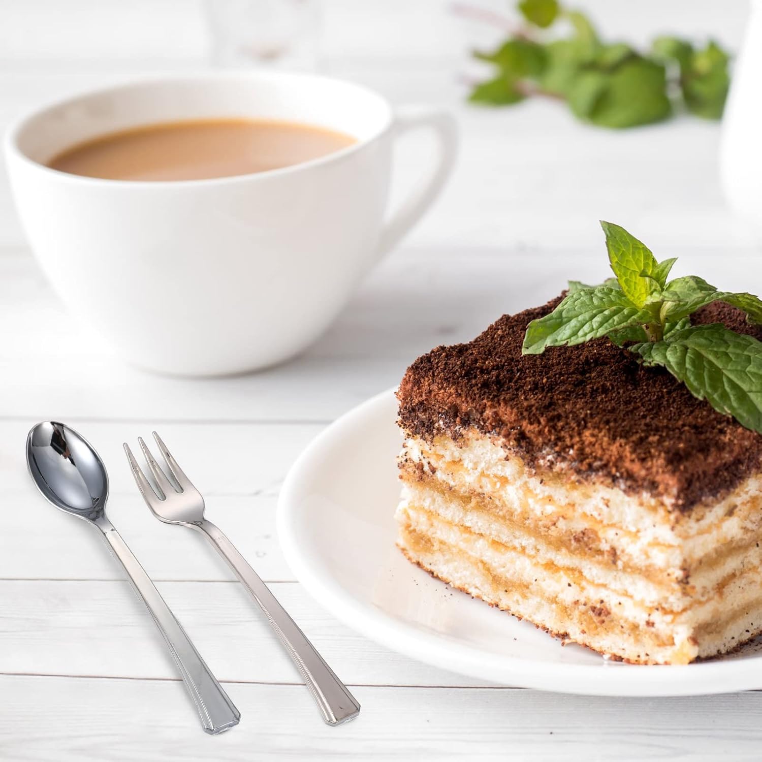 Yinkin 300 Pieces Plastic Mini Appetizer Spoon 4.53 Inch Stainless Steel Finished Silver Disposable Silverware Heavy Duty Plastic Tasting Dessert Forks for Party Wedding Catering