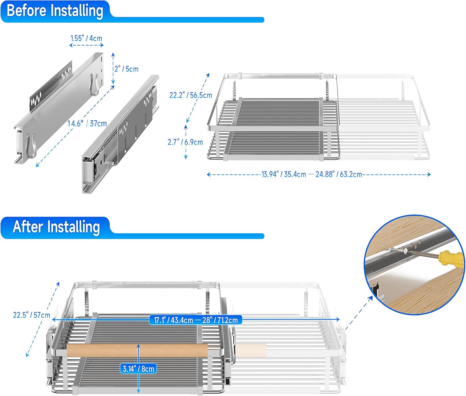 - ✔【High Quality Material】The pull out drawers for kitchen cabinets is made of stainless steel, which can directly contact tableware and food, and is very safe, waterproof and rust proof; Stainless steel metal pull out drawers for kitchen cabinets is more durable and more supportive than ABS plastic basket; Simple and low-key colors can match with cabinets of various styles, suitable for a variety of family styles