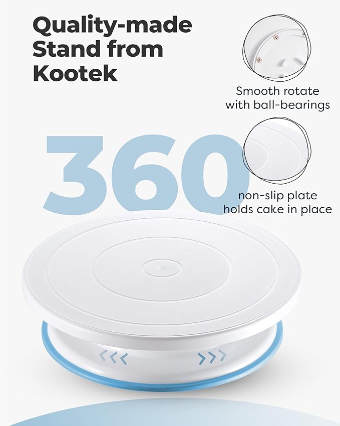 - 360° Spinning Cake Turntable: This essential baking supplies tool features a cake stand with an 11-inch diameter that spins smoothly on a hidden ball bearing, allowing you to achieve stunningly consistent patterns and gorgeous designs. With 360º clockwise and counterclockwise rotation, you can decorate cakes like a pro.