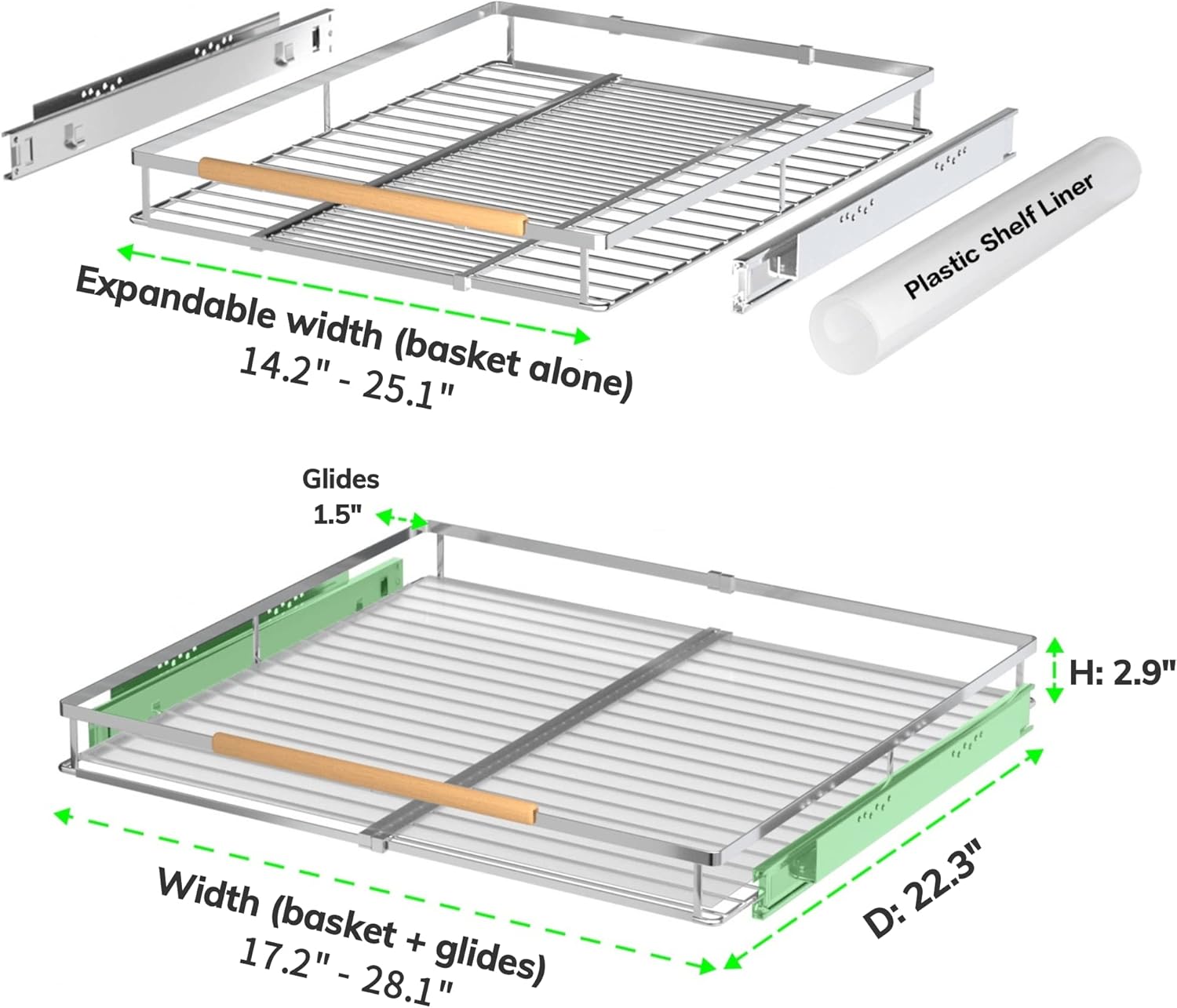 - EXPANDABLE DESIGN: This pull out cabitnet shelf is designed to fit in most cabinets. The width of the wire basket can be adjusted from 17.2β to 28.1β. The new expandable design gives you a better experience and saves your space