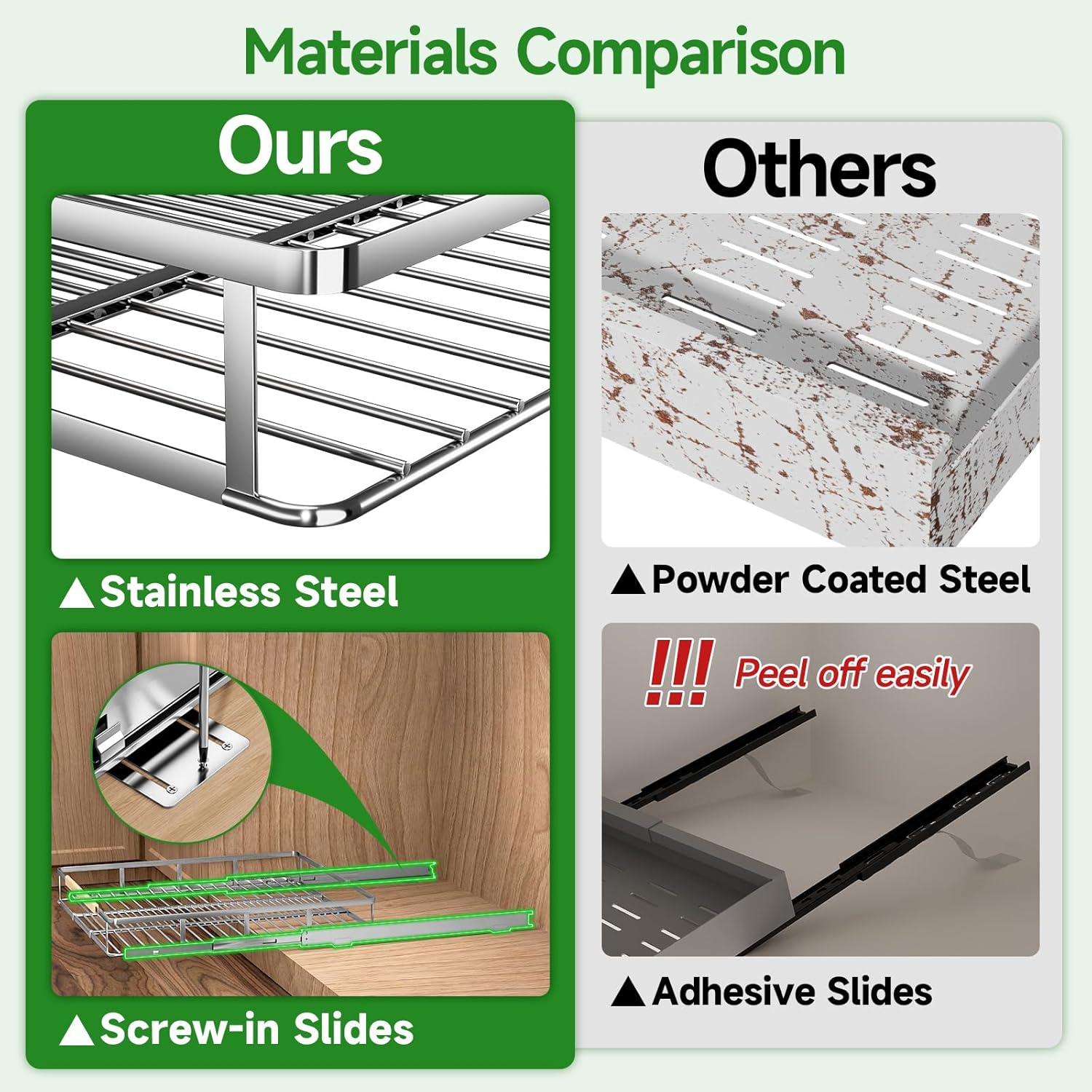 - HIGH QUALITY STAINLESS STEEL: This pull-out storage shelf is made of high quality stainless steel. Its stability and durability make it great for your kitchen, bathroom, under sink, wardrobe and pantry storage organizing