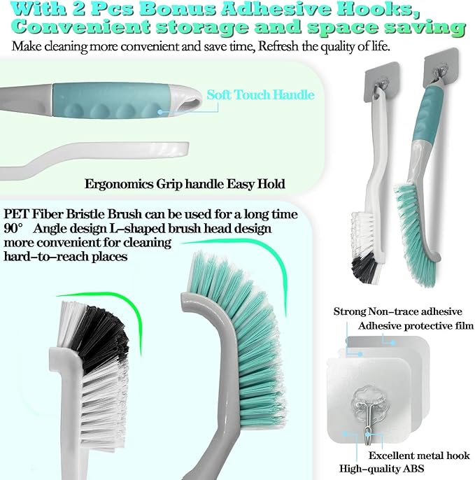 - 【User Friendly Design】Ergonomic Design-Comfortable handle. The Handles are made of High-quality plastic ABS and tough PP material, the brushes are made of premium PET fiber bristles, which are strong and durable without losing bristle. Easy to use, easy to store only hanging hold on adhesive hooks.