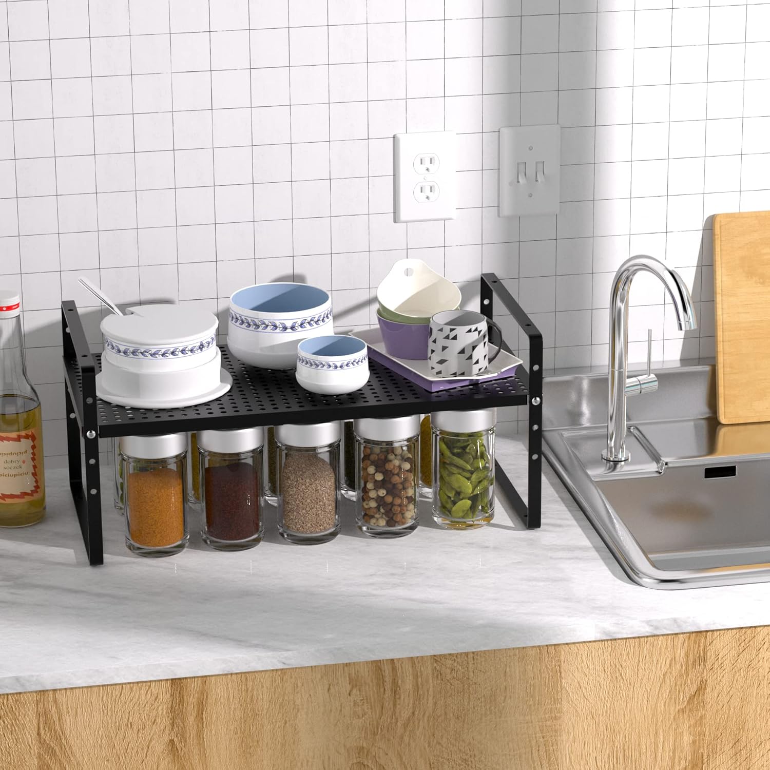 - 【Expandable and stackable design】--The Adjustable Countertop Organizer (collapsed) measures 16.5" L x 10.2" W x 9.8" H, expands from 16.5" to 27.5" wide. You can also stack two shelves together to create a two-tier storage space.