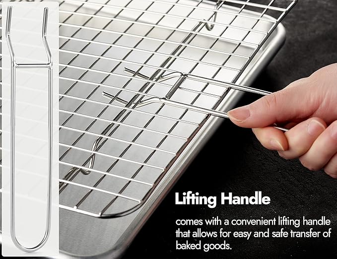 - Drains Grease - Pair your cooling rack with a 1/4 size sheet pan to allow excess oil to drain through from fried and boiled food, such as fried chicken, bacon, boiled vegetables. It will keep food from sticking to your sheet pans and facilitate the cleaning.